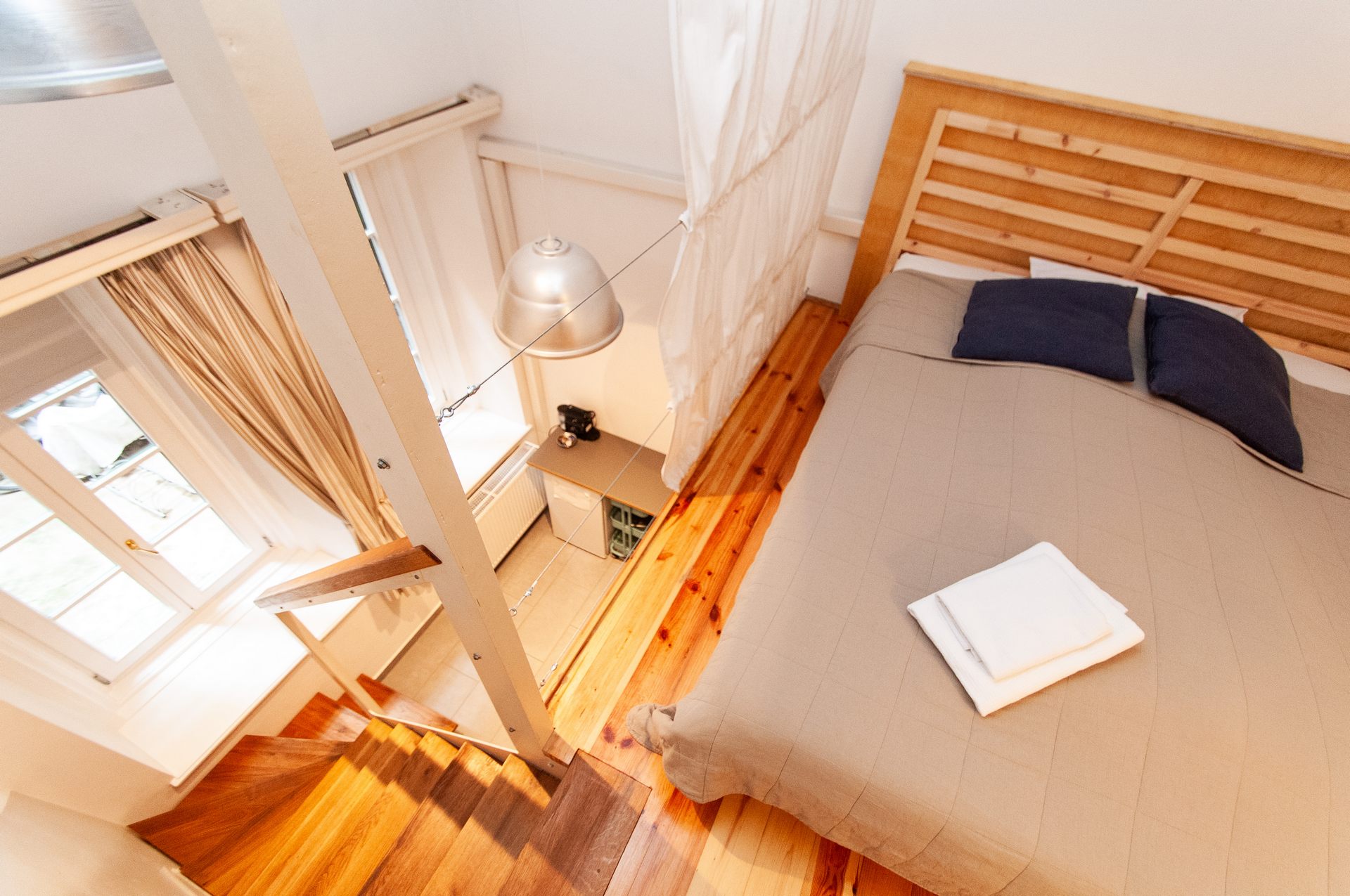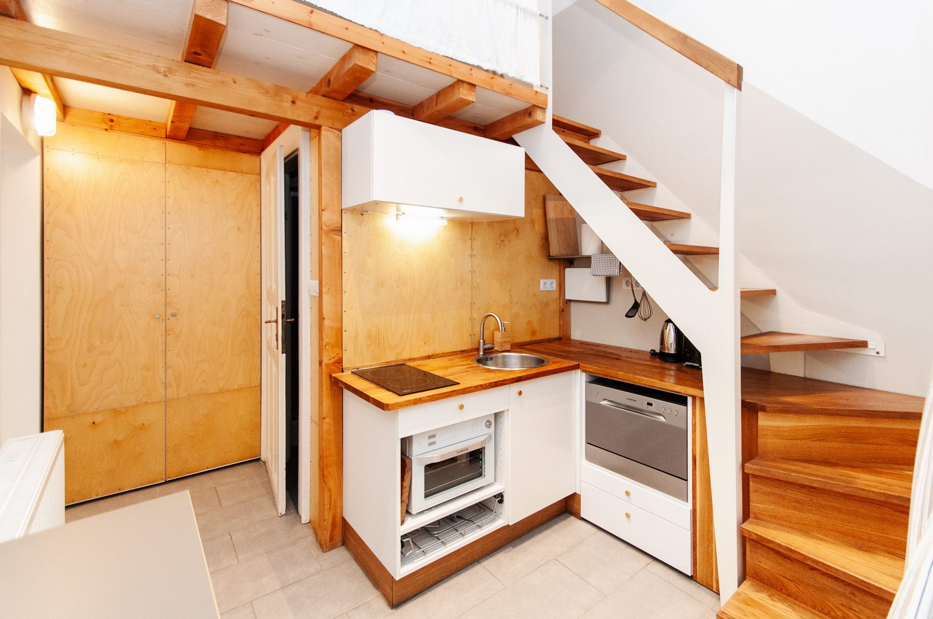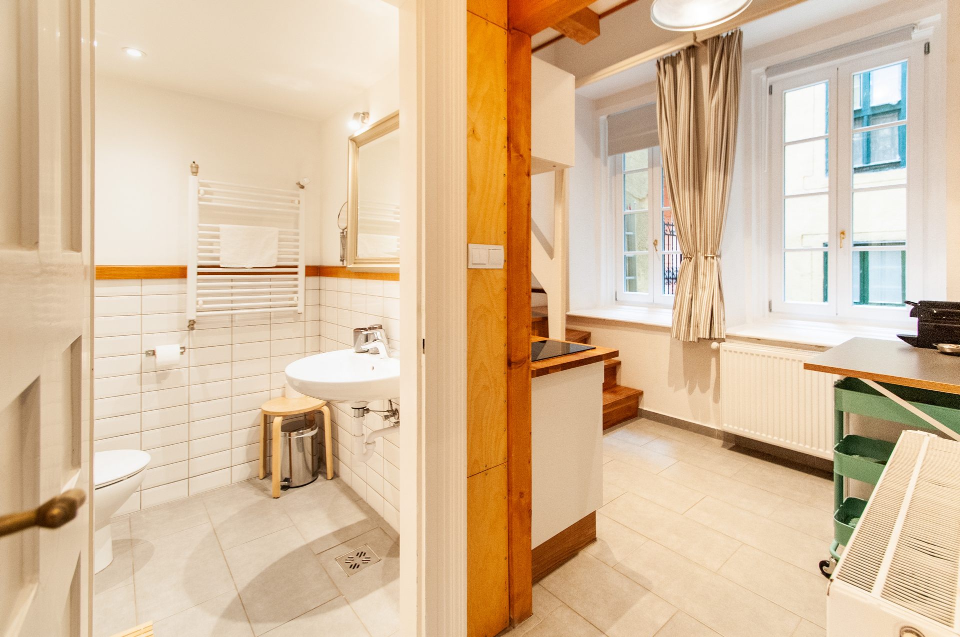 There are two separated rooms stylishly designed equipped with queen-size beds. Separated bathroom and kitchen corner. Ideal for even two couples or family with children.