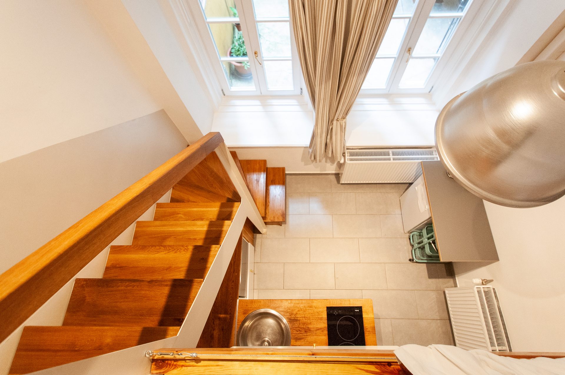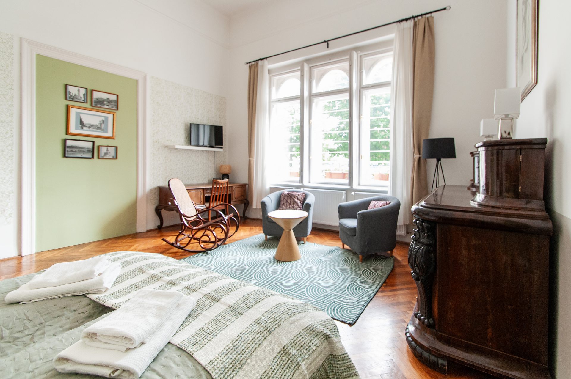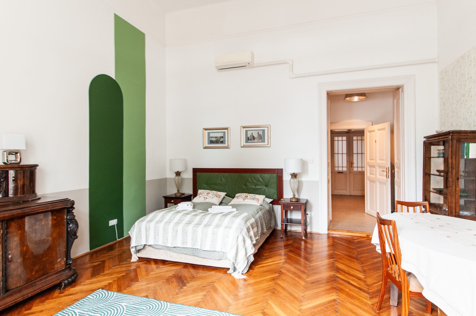 There are two separated rooms stylishly designed equipped with queen-size beds. Separated bathroom and kitchen corner. Ideal for even two couples or family with children.